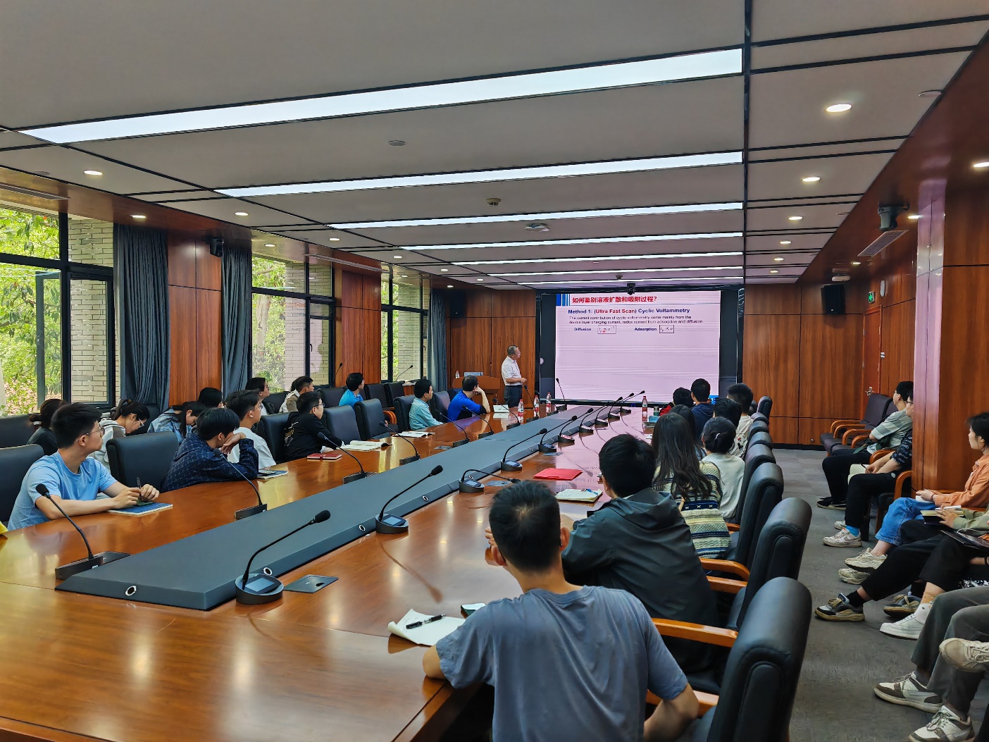 在本次报告中,詹教授详细介绍了循环伏安法这一经典电化学研究方法,通过对电极过程自由扩散行为和表面电化学行为(包括法拉第吸附、表面扩散和溢流)的伏安特性分析,展示了如何利用循环伏安法实时工作场景下测定电活性吸附物种的表面迁移性。他特别强调了在实验中关注细节、半定量或定量处理实验数据的重要性,并鼓励研究生同学们培养良好的科研习惯。报告中,詹教授还分享了关于纳米电极的特性、石墨烯储氢的表面电极过程等前沿研究成果。他提出的电化学储氢、制氢和用氢“三位一体”的概念,为氢能的高效利用提供了新思路。