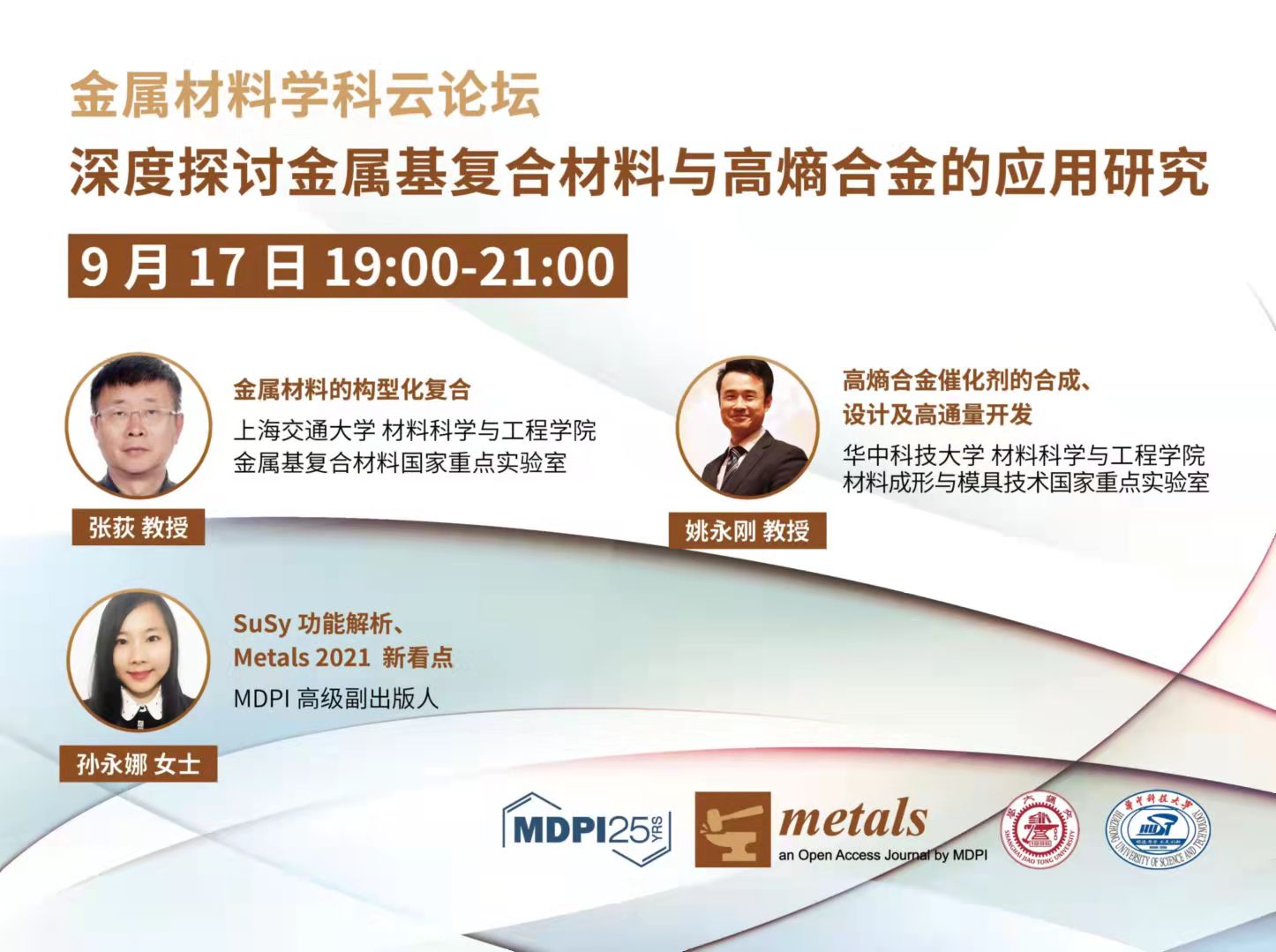 2021年9月17日,新金属材料中心姚永刚老师应邀参加MDPI出版社组织的“金属材料学科云论坛”,深度探讨金属基复合材料与高熵合金的应用研究,此次论坛在寇享、科研云等多个平台进行直播。威廉williamhill、材料成形与模具技术国家重点实验室姚永刚教授做邀请报告,主题为:高熵合金催化剂的合成、设计及高通量开发。参与此次报告的还有:上海交通大学威廉williamhill、金属基复合材料国家重点实验室张荻教授,及MDPI高级副出版人孙永娜女士。