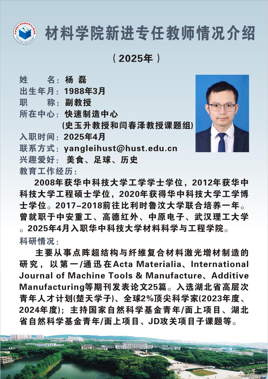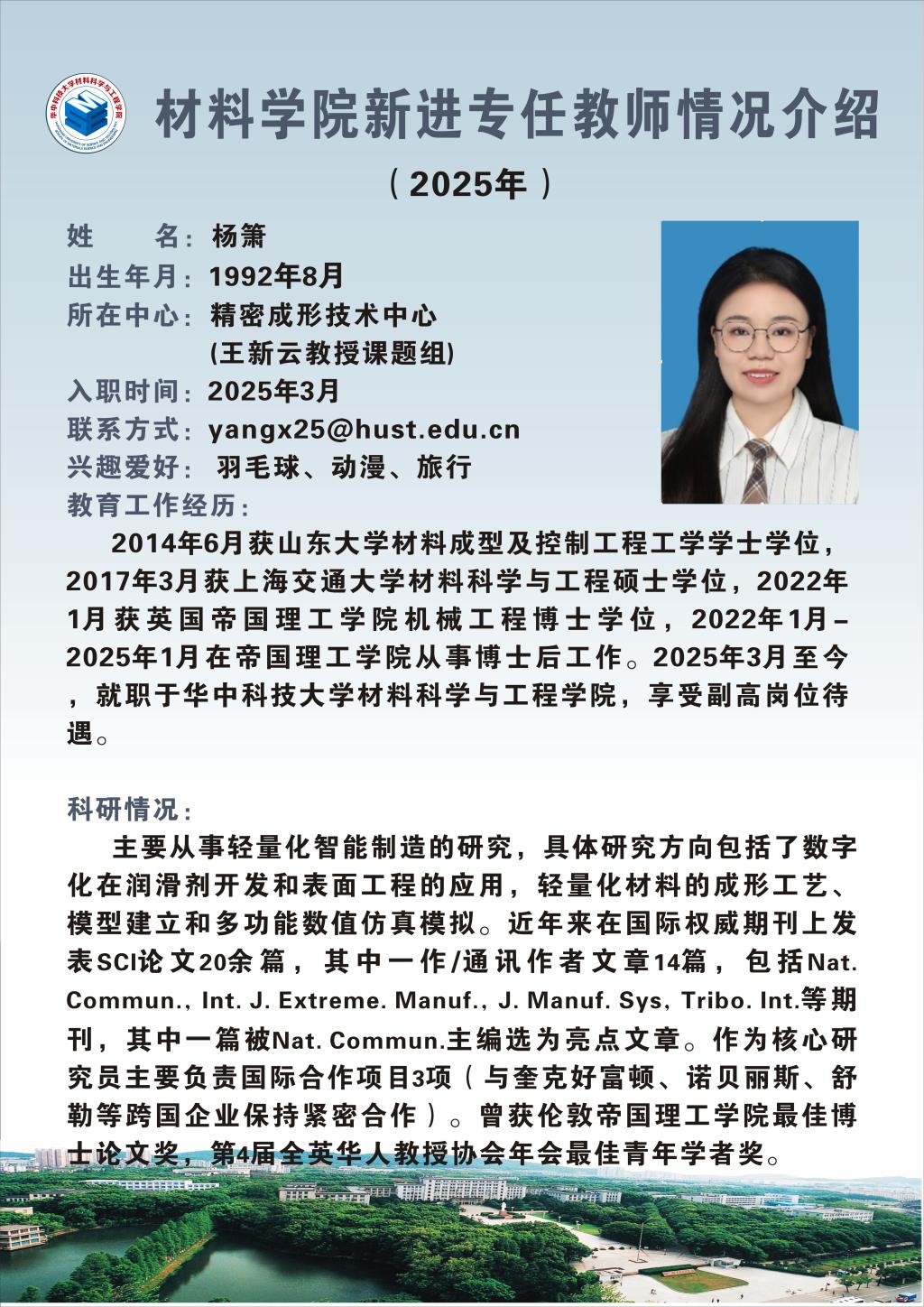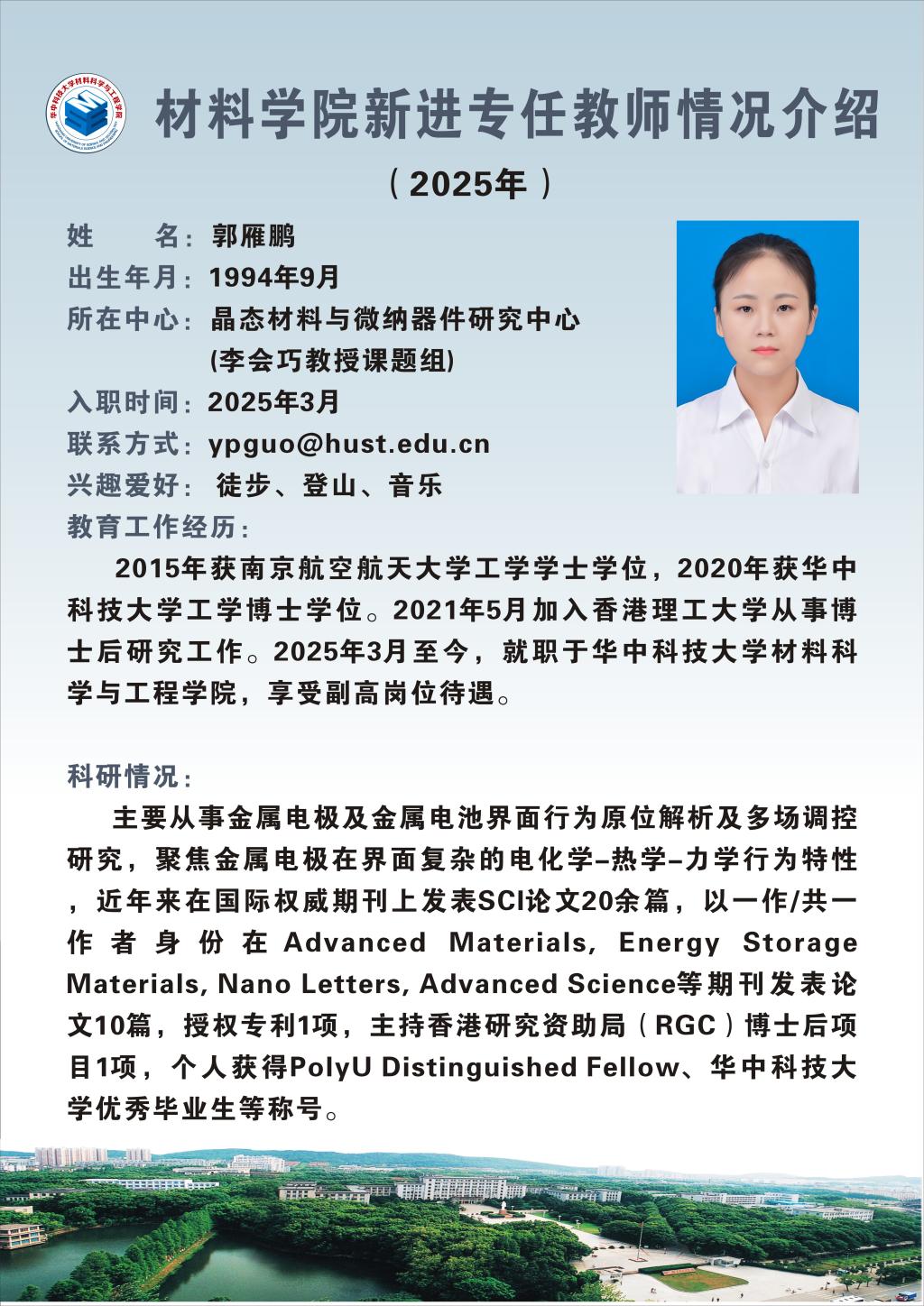 为增进大家对新进教师的了解,方便进一步沟通联系,更新材料学院2025年新进教师的情况介绍如下: