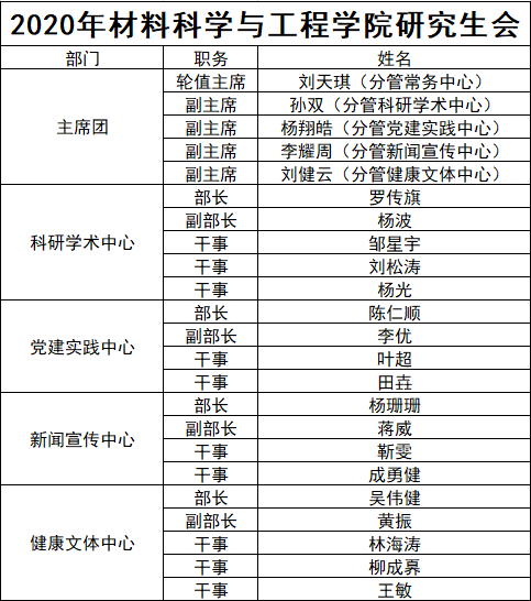 经本人申请,学院面试考察,研究生换届大会推举,现已产生材料学院2019—2020学年度研究生会成员名单。现将该名单公示如下: