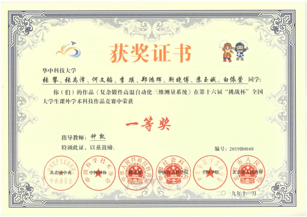 2019年第十六届“挑战杯”全国大学生课外学术科技作品竞赛全国一等奖