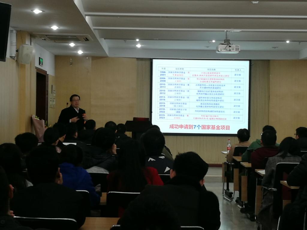 2018年11月20日晚,应材料学院副院长杨君友邀请,武汉理工大学材料复合新技术国家重点实验室赵文俞教授在先进制造大楼西楼A308给学院研究生做了一场“漫谈如何提升科研能力”——“学术船行千里,诚信迎风为帆”导师与你面对面主题讲座。赵文俞教授从培养科研兴趣体会、申请科研项目体会和发表科研论文体会等三个方面和同学们分享他对“如何提升科研能力”的一些思考。