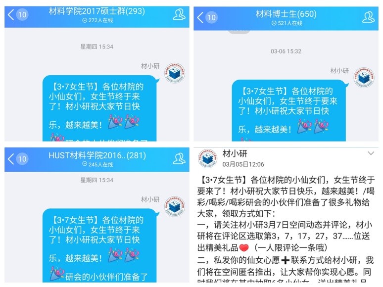 (通讯员:周万里)2019年3月6日,三七女生节来临前夕,材料学院研究生会通过学院研究生会官方QQ号“材小研”在研究生群和QQ空间发布“绽放青春”女生节活动通知为即将到来的女生节活动暖场,鼓励大家积极参加“绽放青春”女生节活动,希望大家做最美的女神。