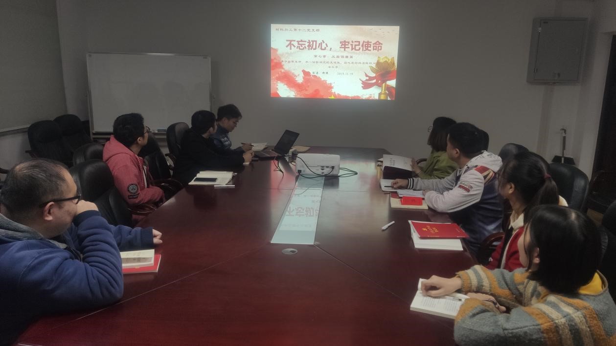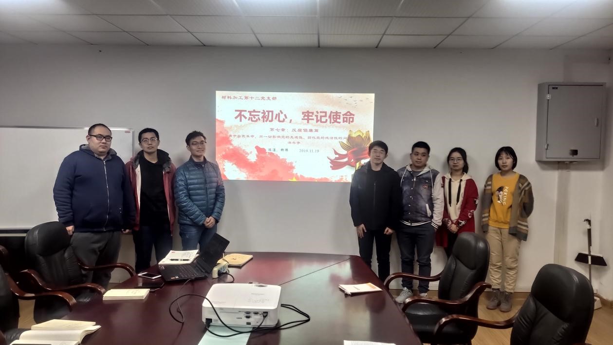 (通讯员 邵雨曼)2019年11月19日,材料学院材料加工第十二党支部在东八楼二楼会议室召开党支部组织生活会,本次生活会主题以“不忘初心、牢记使命--第七章:反腐倡廉篇”为主题,会议由党支书、2016级博士李建宇主持,全体党员和入党积极分子参加会议。