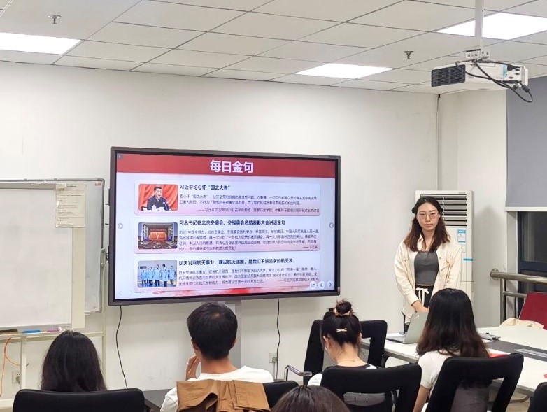 在金句分享环节,赵一男、夏雨涵和夏欣妍同志依次分享了“国之大者” 、“冬奥会精神”、“中国航天梦”相关的金句背景及解析。分享者主动学习时事热点,听者获取丰富的理论政策信息,全体支部成员理论素养进一步提升,共建学习型党支部。