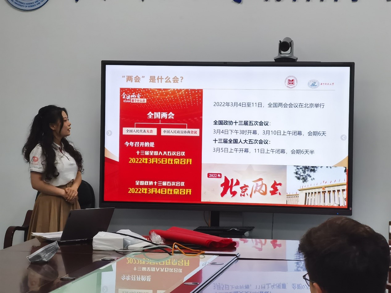 为提升支部成员的理论水平,提升支部成员的学习热情,本次活动第一环节邀请了校学讲团赵亚琳硕士来为本支部党员同志上课,课程主题为《民之所盼,国之重托-2022 两会精神导读》。赵亚琳同志先从“百年变局,宏伟擘画”出发,细致地解释了我国正处在中华民族伟大复兴的战略全局和百年未有之大变局,强调了党员同志应正确认识和把握两个大局;然后从“逆势而上,成绩斐然”为关键词,系统地讲述了我国在2021年所取得的成绩,其中,我国在2021年GDP增长达到8.1%,货物进出口总额增长21.4%,居民人均可支配收入实际增长8.1%,疫苗接种覆盖率超过85%,这一组组数据,让在座的每一位同志感受到祖国的强大;之后亚琳同志从“攻坚克难,砥砺奋进”出发,激情地描绘了2022年的政府工作任务,并鼓励每个人都奋勇向前,让2022年不留遗憾,最后,亚琳同志以“不负韶华,赓续前行”为总结,并结合70周年校庆主题,激励大家敢担“立德树人”大任、勇攀“科技创新”高峰,助力实现高水平科技自立自强,奋力为实现全面建成社会主义现代化强国第二个百年奋斗目标作出更大贡献!支部书记张稳总结道,在2022年全国两会上,习近平总书记把握新的时代方位,观大势、谋全局、明方向,回顾新时代党和人民奋进历程,首次鲜明提出“五个必由之路”的重大论断,阐述我国发展仍具有的战略性的“五个有利条件”,深刻揭示了新时代我们为什么成功、未来我们怎样继续成功的中国密码,具有重大的历史意义和现实指导意义。