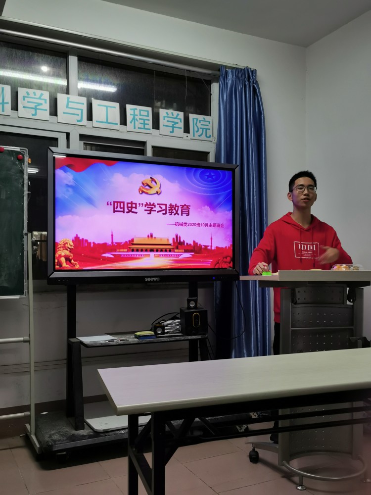 (通讯员 李宗明 姚璋懿 王铭硕)为切实加强“四史”学习教育,在校园文化中弘扬“红色主旋律”,10月27日晚,材料学院机械类2020班在韵苑14栋学生活动室举行了“四史”学习主题班会。2020班教师班主任李箐参与班会并作讲话。