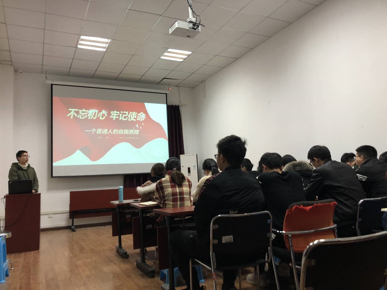 在会议的第一部分,2018级博士冯昕同志先向大家展示了去艰苦地区工作的甘祖昌将军和勤于奉献的妻子龚全珍的视频,两位共产党员舍弃安稳的组织福利生活,甘愿去劳动创造,呈现了非常优秀的共产党员风貌。之后通过周恩来总理、焦裕禄同志、孙少安的故事,再一次强调了共产党员的初心和使命的含义,深刻揭示了每一位优秀党员的精神品质。随后从自身出发,谈及普通人如何坚守共产党员的初心和使命,启发我们普通研究生党员“平常时候看得出来,关键时刻站得出来,危急关头豁得出来”。