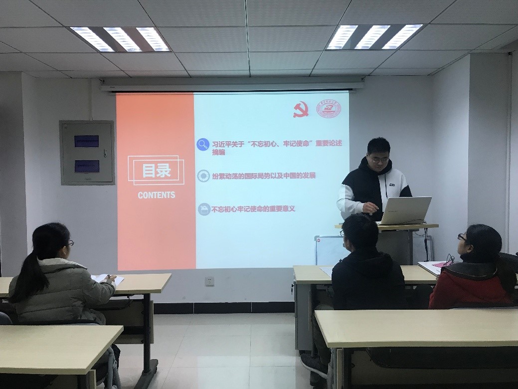 会议初始,新生党员文晓琨同志为大家讲解:中国特色社会主义进入新时代,我们比历史上任何时期都更接近、更有信心和能力实现中华民族伟大复兴。我们千万不能在一片喝彩声、赞扬声中丧失革命精神和斗志,逐渐陷入安于现状、不思进取、贪图享乐的状态,而是要牢记船到中流浪更急、人到半山路更陡,把不忘初心、牢记使命作为加强党的建设的永恒课题,作为全体党员、干部的终身课题。并分析了纷繁动荡的国际局势,以中美贸易战、香港暴乱、中国新疆,反恐前沿为例。