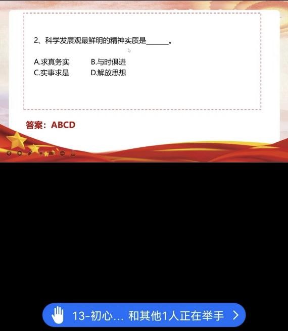 13支队伍按照小程序抽签顺序依次答题,每套题包含4道单选题(2分/道),4道多选题(3分/道),4道填空题(3分/道),规定时间内答对加分,答错不得分;若该队伍未回答正确,其余队伍可进行抢答,答对加分。各队伍轮番上阵,队内成员团结一致,对答如流;不同队伍你追我赶,一时难分高下。