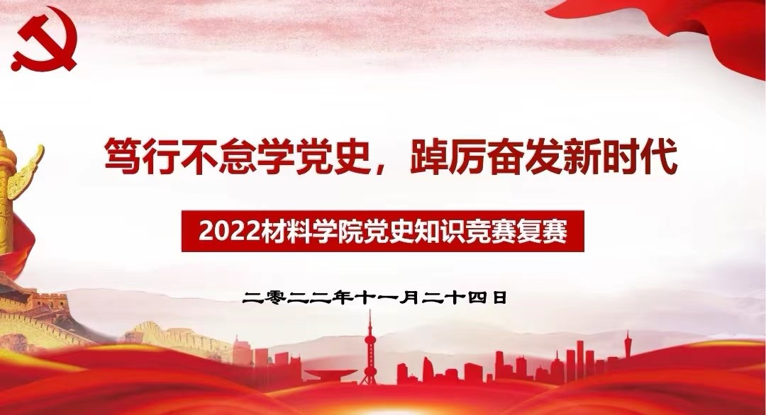党的历史是共产党人百年奋斗的历史积淀,深刻彰显了党在各个历史时期淬炼锻造的伟大精神,是中华民族的宝贵财富。为深入贯彻学习党的二十大精神,巩固党史学习成果,深刻感悟党的伟大历史贡献,11月24日晚,材料学院线上举办“笃行不怠学党史,踔厉奋发新时代”党史知识竞赛复赛。