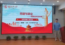 为充分发挥党建引领作用,将党建与就业相结合,坚定科技报国决心,材料学院于2023年5月11日晚在先进制造大楼西楼A308举行了研究生党支部5月支部沙龙,此次支部沙龙的主题为“稳基石,攀高峰,党建就业双共融”。出席此次活动的有研究生工作组组长王曦老师、各研究生党支部支委及材料学院党务中心全体成员,本次活动由党务中心成员张子华同学主持。