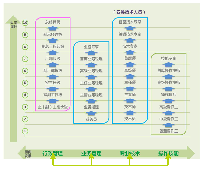 公司倡导并实行“长”(经营管理职类)、“家”(专业技术职类)、“匠”(操作服务职类)分离的多轨制管理,形成了多晋升阶梯的职业生涯发展通道,为员工的个人职业生涯发展提供了多种选择。