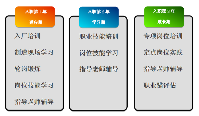 公司新员工培养周期为三年,分为适应期、学习期、成长期三个阶段,每阶段为期一年。适应期目标是融入公司、融入职场,学习期目标是融入岗位、融入团队,成长期目标是融入专业、融入事业。