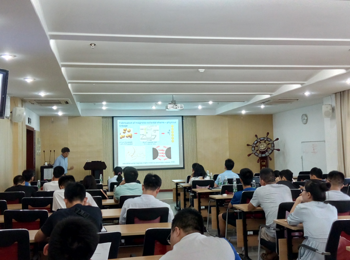 下午3点,吴宁教授在先进制造大楼A308室做了题为“Behavior of Asymmetric Colloids under Electric and Magnetic Fields”的学术报告,陈颖老师主持了此次会议。在报告中,吴宁教授详细介绍了他们课题组近期在各种电场和磁场作用下各向异性粒子的平衡和非均衡行为方面的研究成果。吴宁教授从胶体的定义入手,用生活中常见的物品如牛奶来解释胶体,并引出胶体对我们的日常生活和现代技术的重要性,吸引大家兴趣。随后,他又系统地介绍了各种电场和磁场作用下各向异性粒子的平衡和非均衡行为,并对相关机理进行了详细的解释,通过磁场的控制还可以利用胶体粒子实现颗粒的包覆和转运。报告结束后,现场师生积极提问,就自己感兴趣的地方和不理解的问题与吴宁教授进行讨论,气氛热烈。