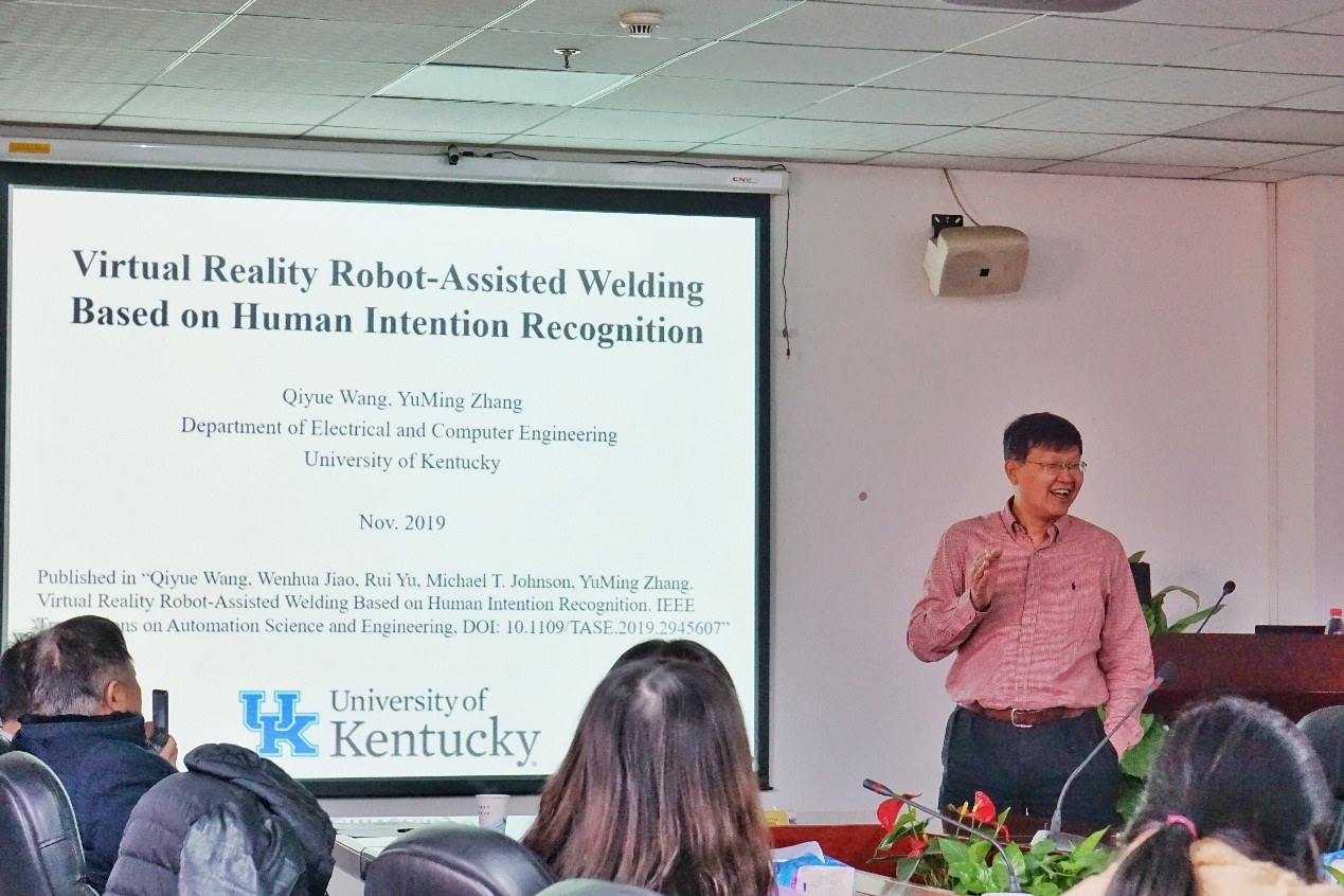 (通讯员张佳佳)2019年12月13日上午10:00,第372期“杰出学者论坛”系列讲座在先进制造大楼西楼C306顺利进行。肯塔基大学电气工程系冠名教授及工学院威廉希尔事务主任张裕明老师作了题目为“Virtual Reality Robot-Assisted Welding Based on Human Intention Recognition”的报告。材料学院党委书记李毅、余圣甫教授、黄安国副教授、外事员刘芳参加了本次座谈。本次讲坛由william威廉中文材料成形与模具技术国家重点实验室庞盛永副教授主持。