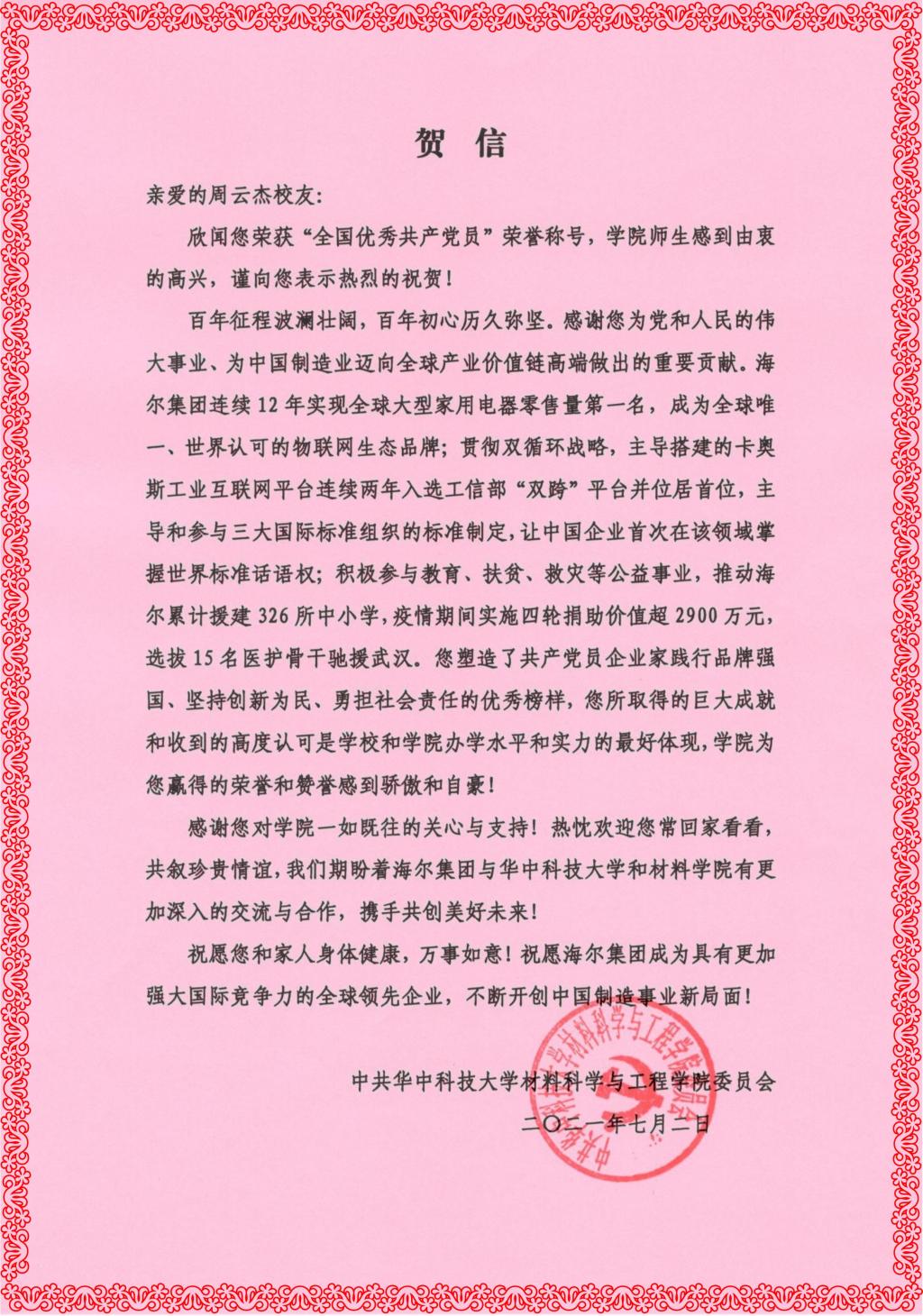 欣闻这一喜讯,材料学院党委代表学院师生向周云杰校友表示热烈祝贺,并对他心系母校、对母校事业发展给予的大力支持表示感谢,学院为他感到骄傲和自豪。贺信全文如下: