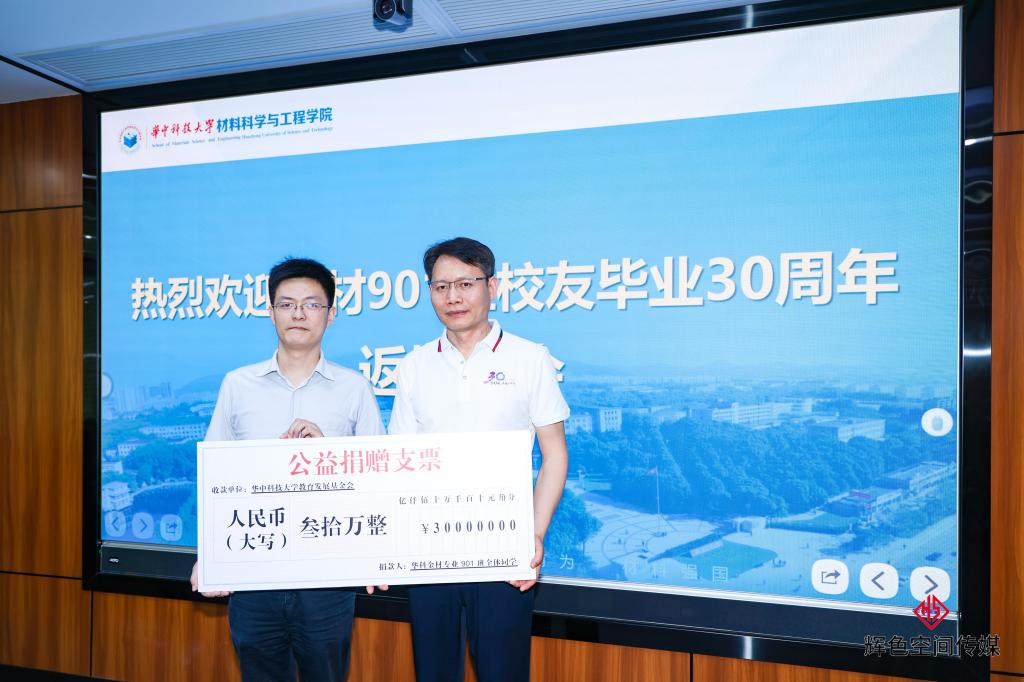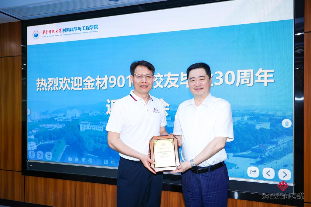 金材901班代表王朝晖表达了对学院培养的感谢,他表示三十年来,金材901班的同学们如今都发展成为各行各业的翘楚,大家都想为母校的发展贡献力量,并借本次返校契机捐赠30万元发起一项奖学金,用于激励人才培养,服务学科建设。在捐赠仪式上,校友工作及对外联络办公室主任、教育发展基金管理处处长戴则健向金材班代表王纪学赠予纪念牌匾及证书,材科科学与工程学院党委书记李冲代表学院接受捐赠支票。