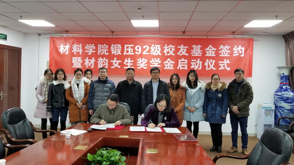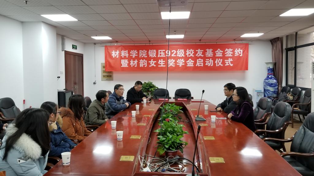 2018年12月28日下午,材料学院锻压92级校友基金签约暨材韵女生奖学金启动仪式举行。院长周华民、副院长袁新华、校基金事务处办公室主任苏锐参加仪式。