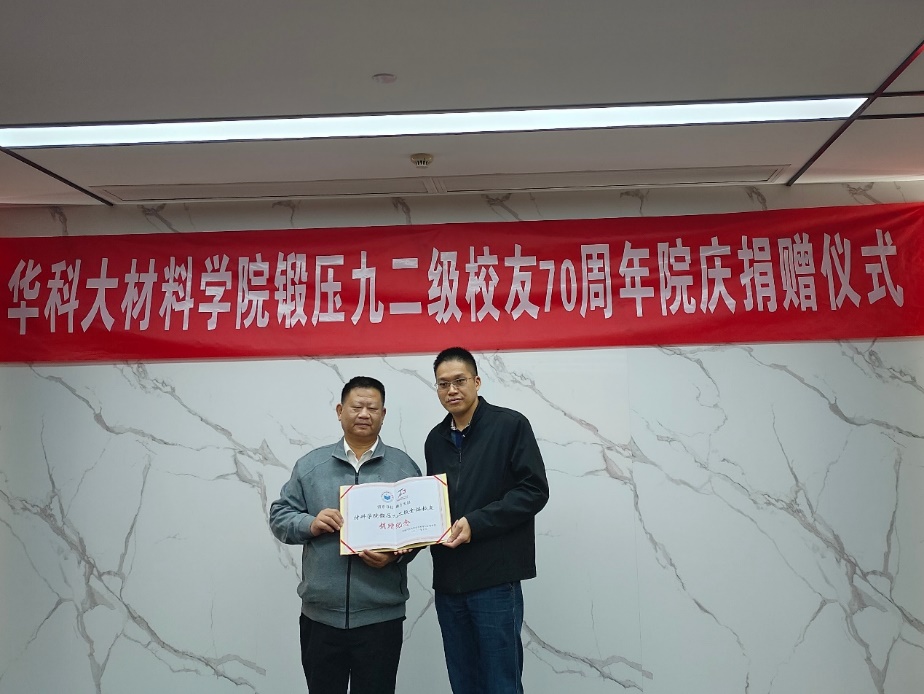 在双方代表的共同见证下,姜勇道校友代表锻压九二级全体校友向学院转交捐赠印章,袁新华副院长代表学院向锻压九二级全体校友授予捐赠证书。