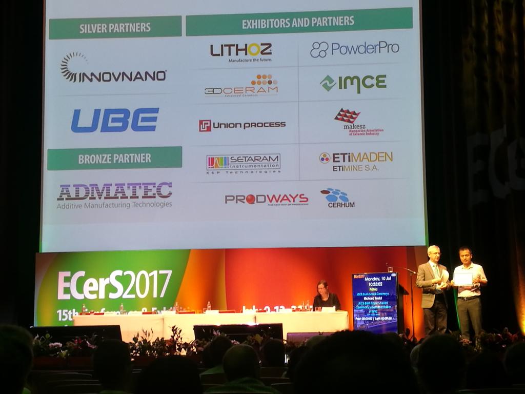 张海波副教授于2017年7月9日在匈牙利举办的第15届欧洲陶瓷学会年会(15th Conference & Exhibition of the European Ceramic Society July 9-13, 2017/Budapest, Hungary)上接受了世界著名陶瓷材料科学家、欧洲陶瓷学会会刊主编、牛津大学的Richard Todd教授的颁奖。该奖项为陶瓷材料领域最高奖项之一,张海波副教授也是该奖项设立以来获得此奖项为数不多的亚洲学者之一。“JECS Best Paper Award”主要是为了表彰张海波副教授多年来在无铅压电陶瓷领域做出的杰出贡献。