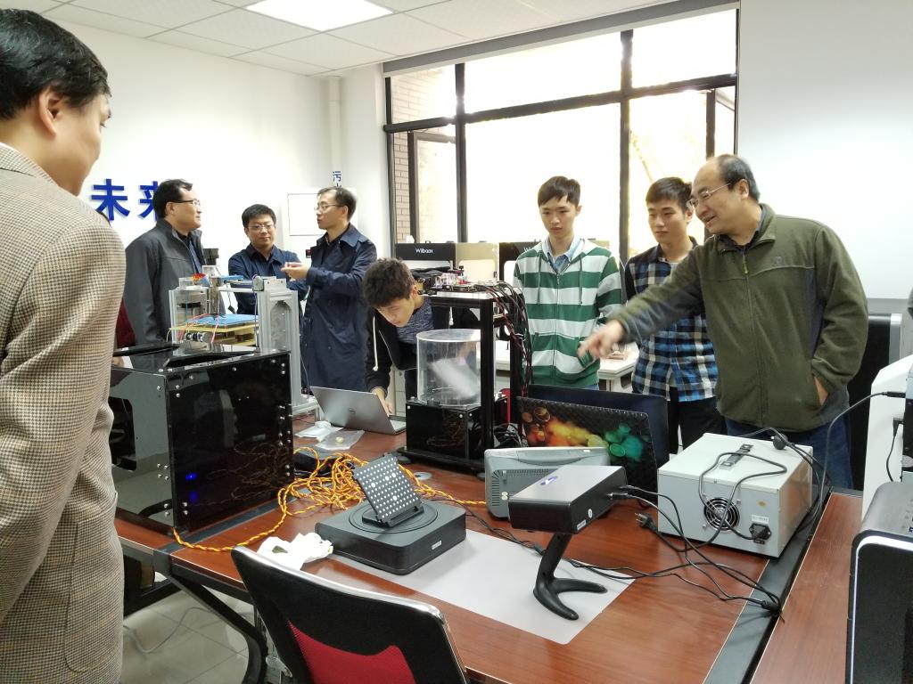 揭牌仪式后,与会人员前往众创空间参观。材料学院3D打印团队成员为大家演示了团队研发的“咖啡拉花机”、“新型粒料3D打印机”、“三维显示器”等项目成果,受到了一致好评。