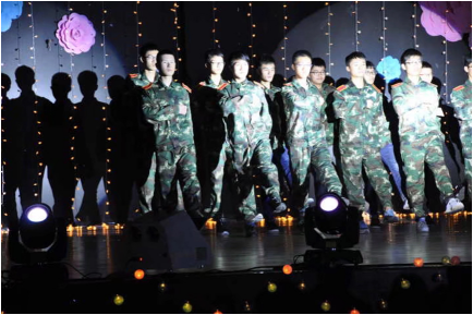 晚会伴随着钢琴独奏声开始。晚会第一个节目就引起材料学院新生深深的共鸣,一排排小绿人整齐地踢正步,向右转,正是新生们军训的缩影。不禁让人回想起从开学时的相遇,军训时的相知,再到现在相守于材料学院,就像本次文化节相遇相识相知三个主题一样。