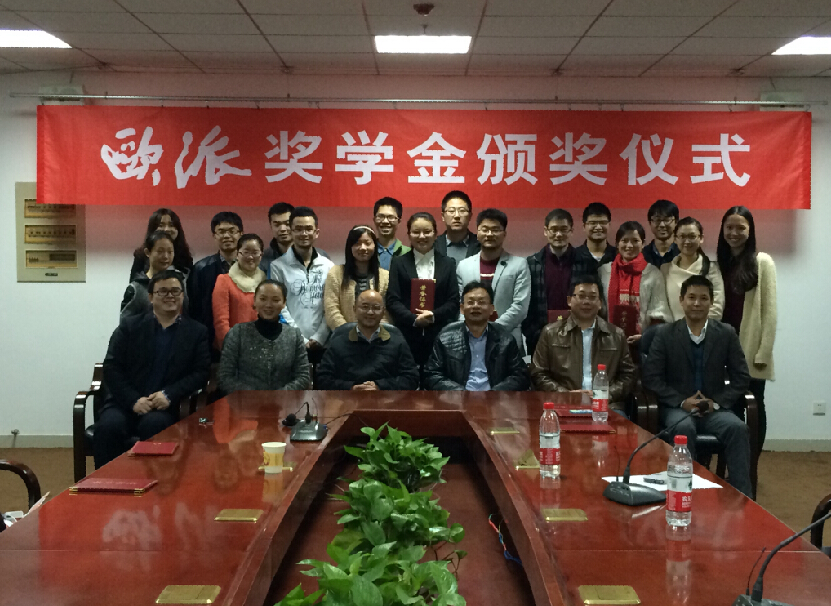 欧派家居集团股份有限公司张家朝先生宣读了获奖同学名单材料学院院长黄云辉教授、欧派家居集团股份有限公司人力资源总监张英强先生一同为本次获得奖学金的3位博士生、9位硕士生、5位本科生颁颁发荣誉证书并合影留念。