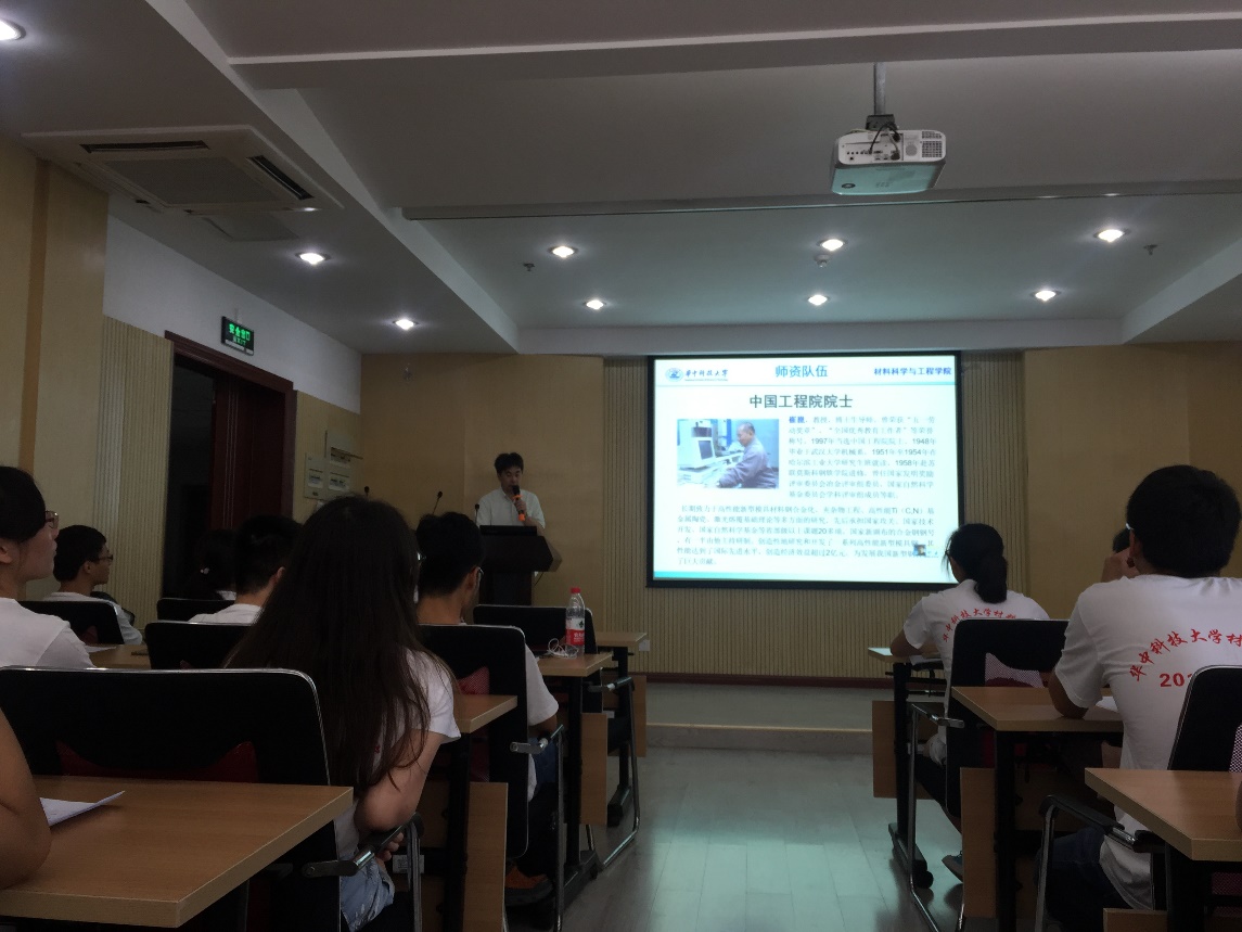 开营仪式结束后,吴树森、杨君友和张晓东三位老师分别介绍了材料加工系、材料系、材料物理化学系的基本情况。周华民、翟天佑、周建新等