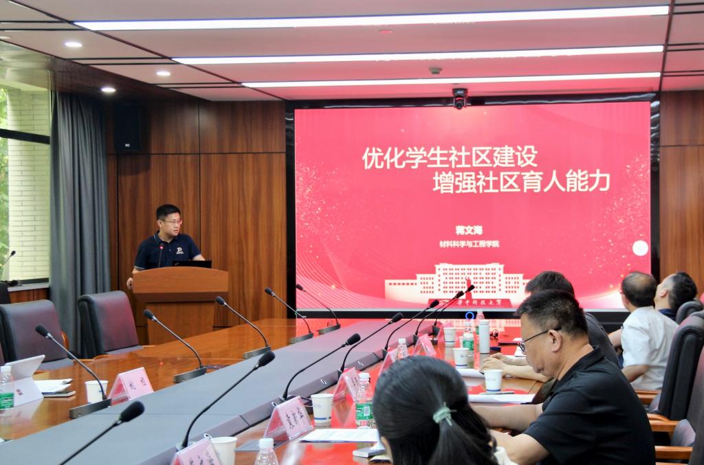 党委副书记蒋文海作学院学生社区建设调研报告介绍,学院就“优化学生社区建设,增强社区育人能力”专题开展深度调研,组织学生座谈会4场、其他院系交流座谈1场、集体研讨2场。调研提出解决方案并制定工作计划,一是加强党建引领,让党建力量和党建活动走近社区,二是建立学生安全信息网格体系,优化寝室长队伍制度,构建体制机制,三是打造特色社区课程,建设“材料强国”文化墙,加强资源投入,做到“平台育人”“管理育人”“课程育人”。