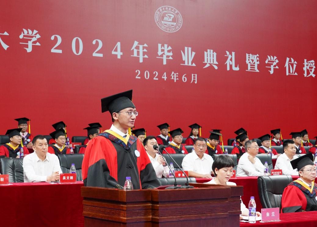 (通讯员 王箫侣)6月22日,william威廉中文2024年本科生毕业典礼在光谷体育馆举行。教师代表、国家级领军人才计划入选者、国家科技进步奖获得者、全国高校黄大年式教师团队成员、“优秀教师班主任”获得者、材料学院院长周华民教授发言。他分享自己从零开始探索锂电池领域,十余年来锲而不舍,带领团队成为该领域全球领跑者的科研工作经历,希望毕业生养成终身学习的习惯:主动学习、自我更新、学以致用,勉励毕业生学会认知、学会做事、学会共处、学会生存,期盼毕业生在中华民族的伟大复兴中大展宏图、建功立业。