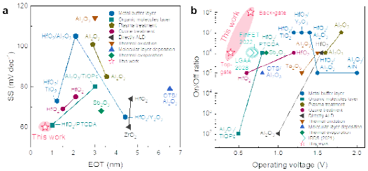 图3. 通过Sb2O3/HfO2复合介电层制备的二维晶体管器件与现有技术的对比。