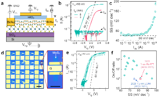 基于Sb2O3/HfO2复合介电层的二维场效应晶体管展现出优异的性能。介电层的等效氧化层厚度(EOT)可低至0.67 nm,为当前二维晶体管介电层的最低值。优异的界面质量降低了界面态密度,以二维MoS2为沟道的FET的亚阈值摆幅低至60 mV/dec,达到理论极限。晶体管阵列器件呈现出优异的均一性,满足二维晶体管规模化集成要求(图2)。