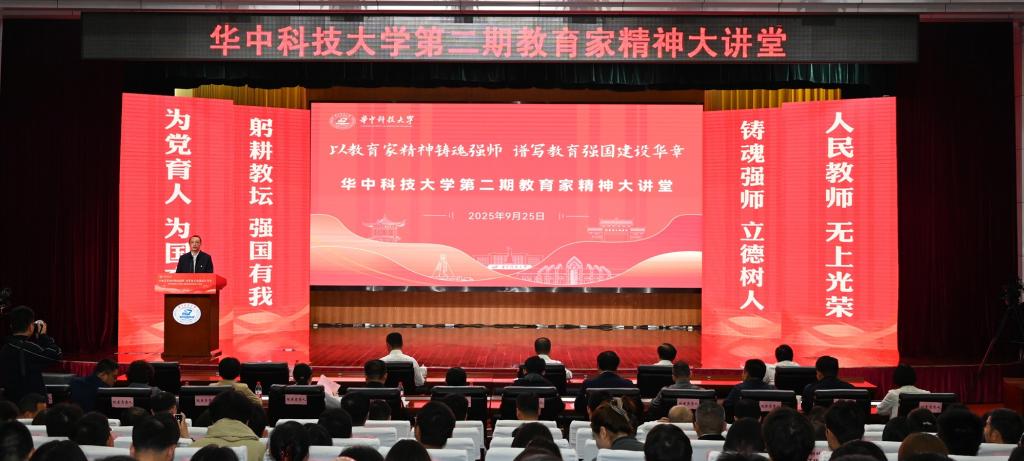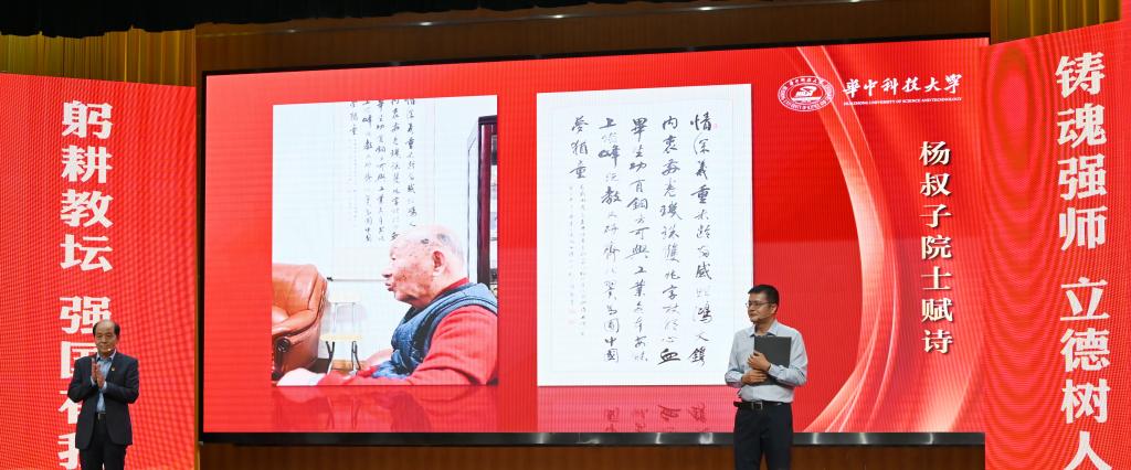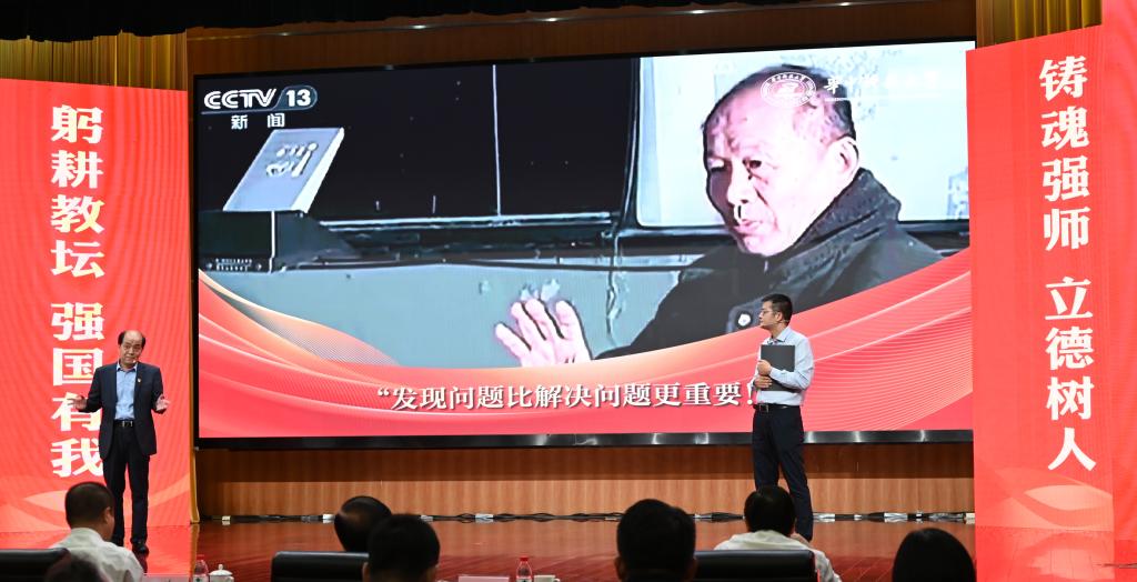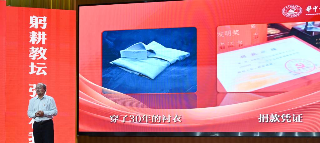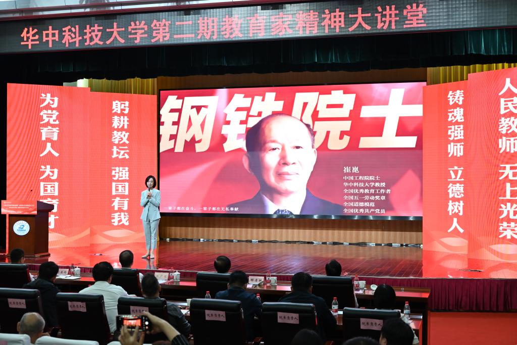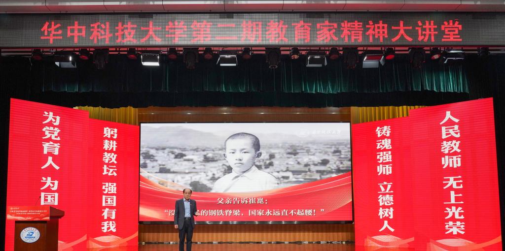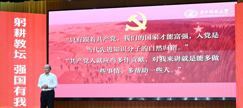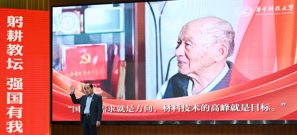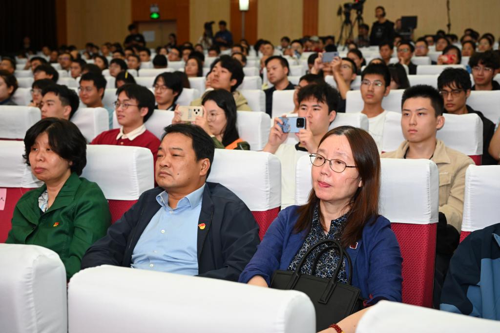 崔崑院士在寄语视频中表示,实干是华科大人一以贯之的优良传统,希望广大教师继续弘扬实干作风,始终胸怀“报国”之志、永葆“勤奋”之心,积极投身学校建设与发展事业,为推动社会进步贡献智慧与力量。现场观众认真聆听宣讲。
