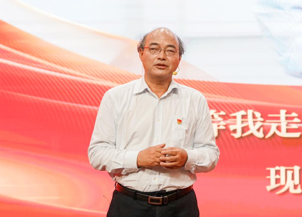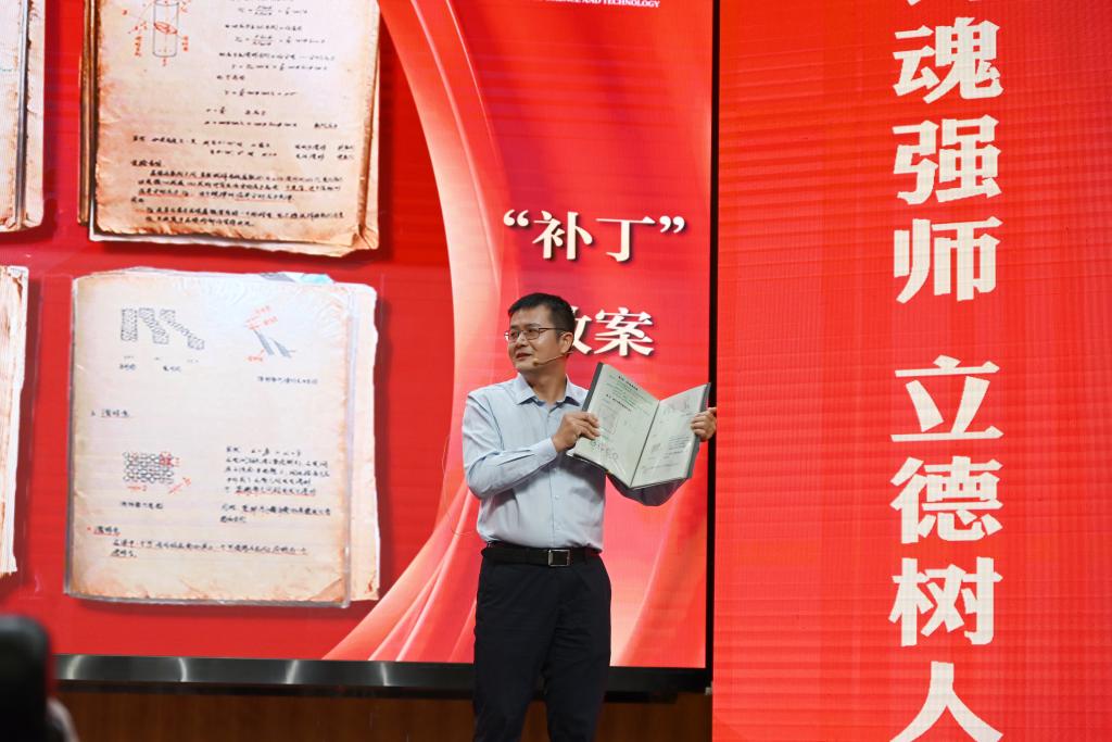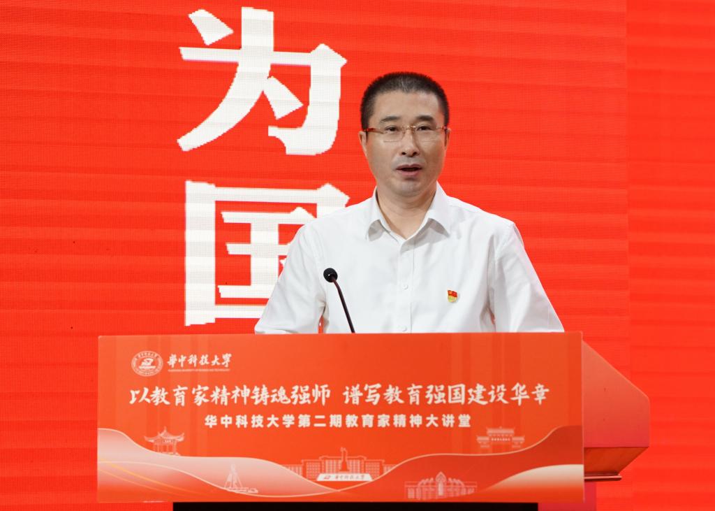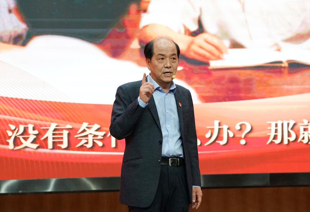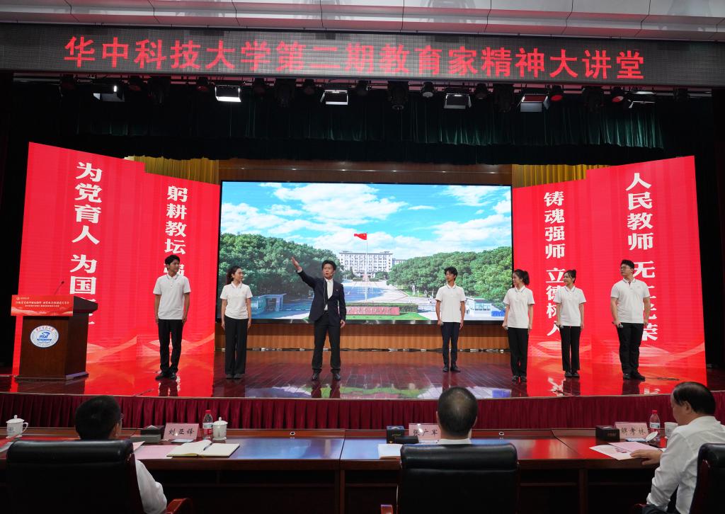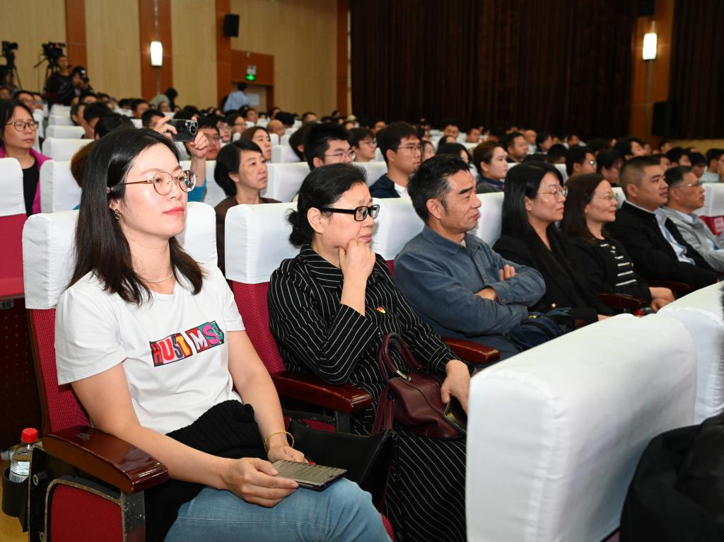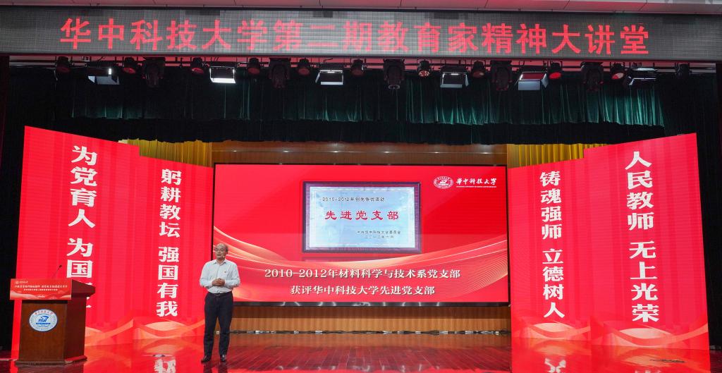 崔崑院士在寄语视频中表示,实干是华科大人一以贯之的优良传统,希望广大教师继续弘扬实干作风,始终胸怀“报国”之志、永葆“勤奋”之心,积极投身学校建设与发展事业,为推动社会进步贡献智慧与力量。现场观众认真聆听宣讲。