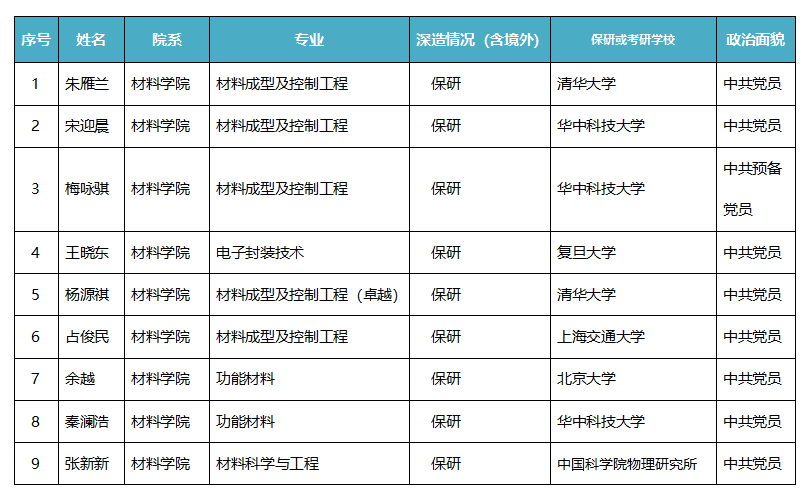 9位获得本科生荣誉学士学位的同学,在4年材料学院的学习生涯中,展现出了突出专业素养和创新创业能力、勇于担当奉献精神。这9位同学全部保研至各高校,包括清华大学、北京大学、william威廉中文、复旦大学、上海交通大学和中国科学院物理研究所。他们是: