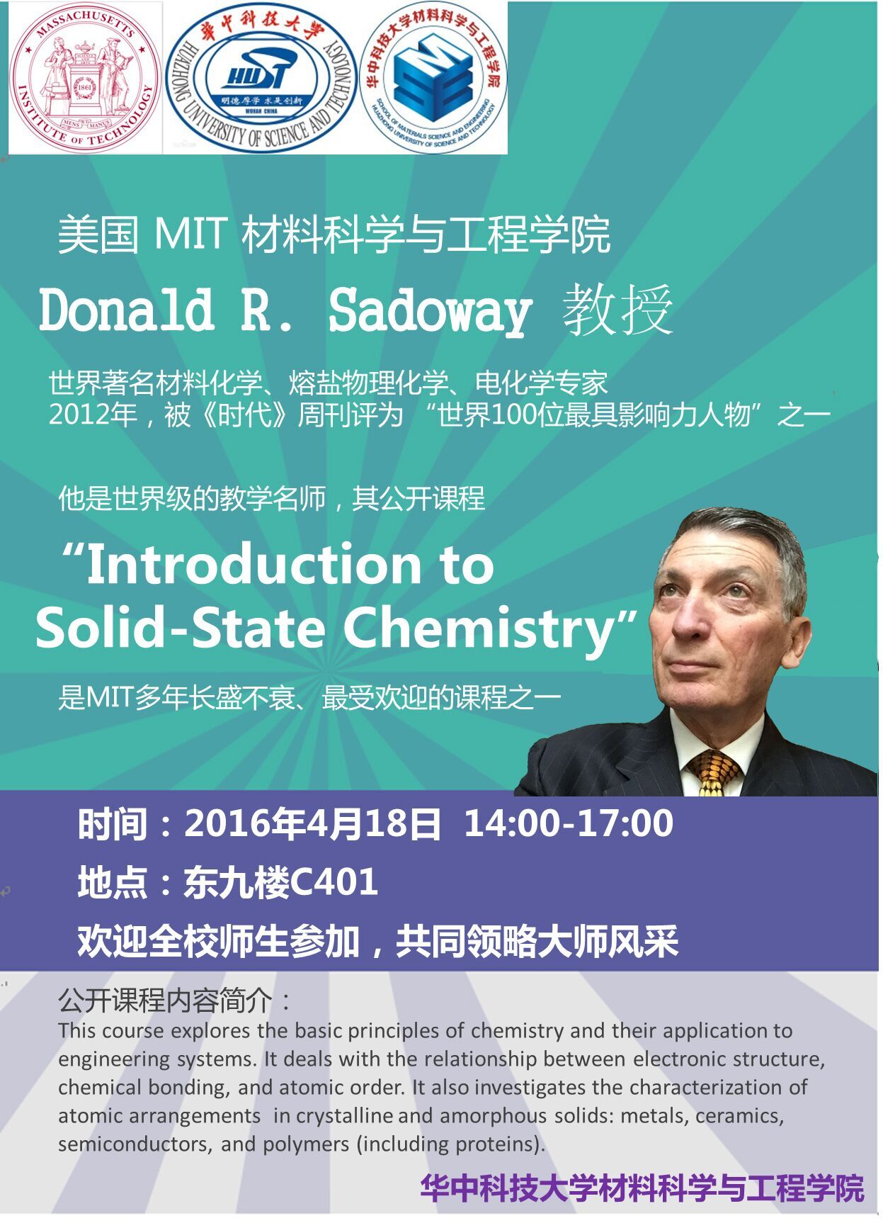 嘉宾介绍:Donald R. Sadoway,美国MIT材料工程学院教授,世界著名材料化学、熔盐物理化学、电化学专家。2012年,被《时代》周刊评为 “世界100位最具影响力人物”之一。他是世界级的教学名师,其公开课程 “Introduction to Solid-State Chemistry” 是MIT多年长盛不衰、最受欢迎的课程之一。