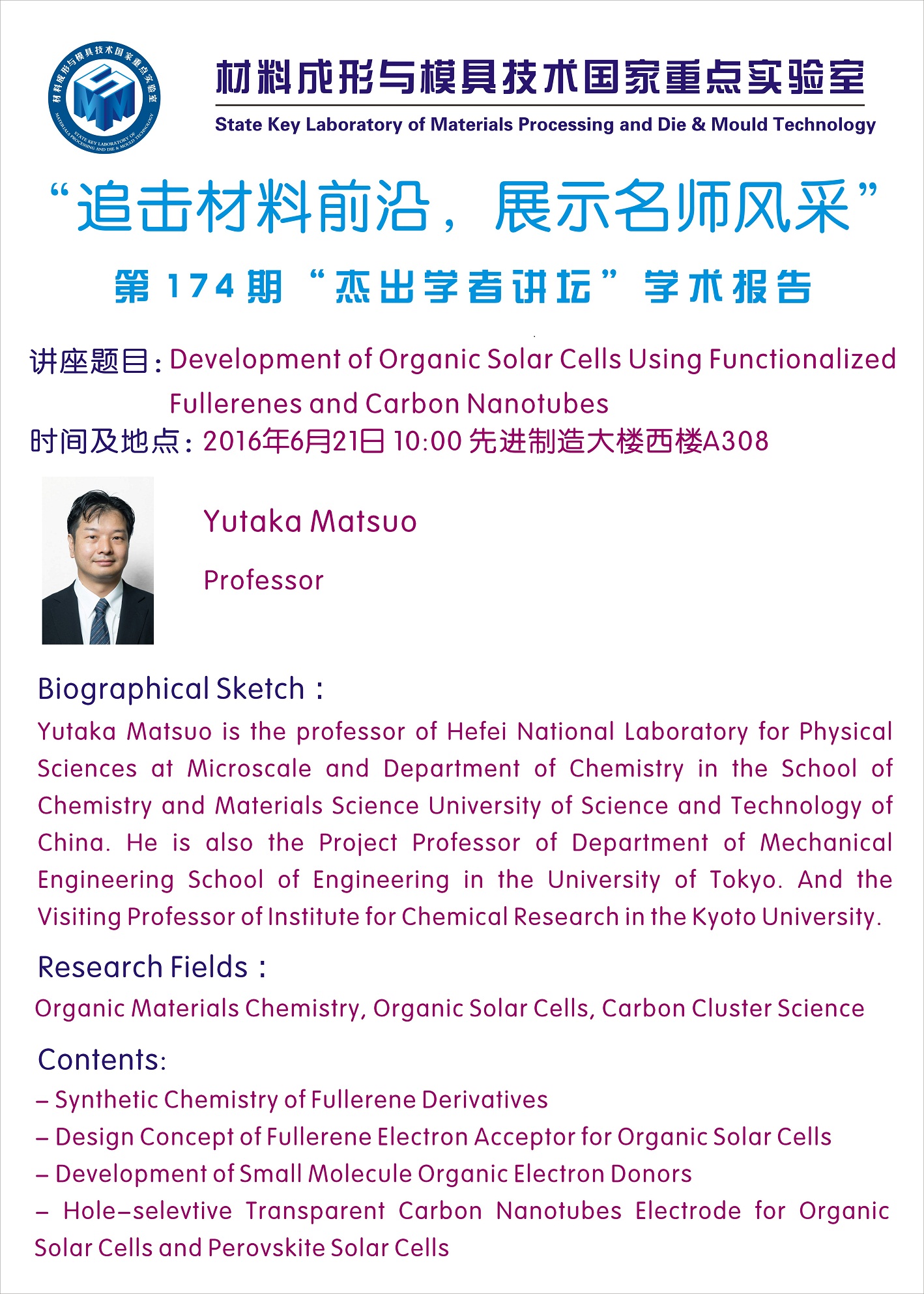 【6月21日】第174期“杰出学者讲坛” Development of Organic Solar Cells Using Functionalized Fullerenes and Carbon Nanotubes