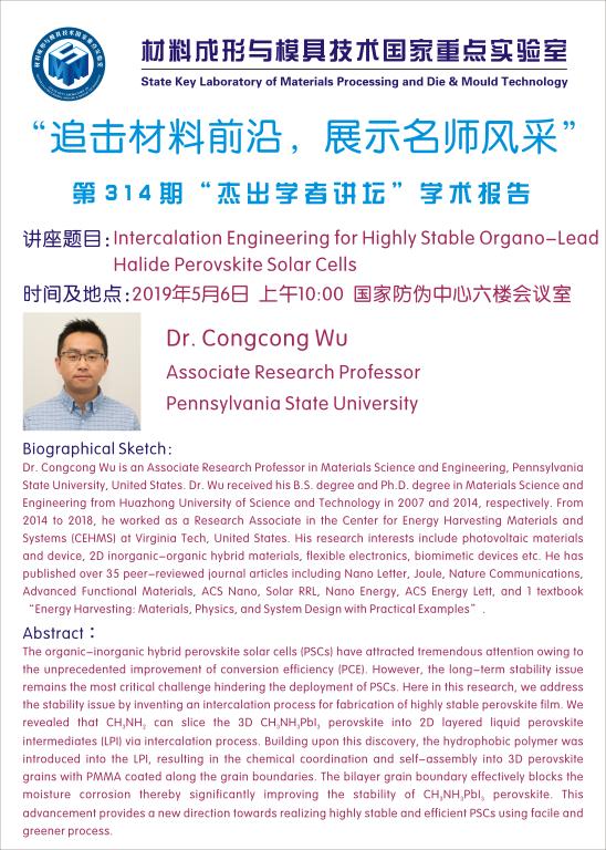 第314期杰出学者讲坛——Pennsylvania State University Dr. Congcong Wu