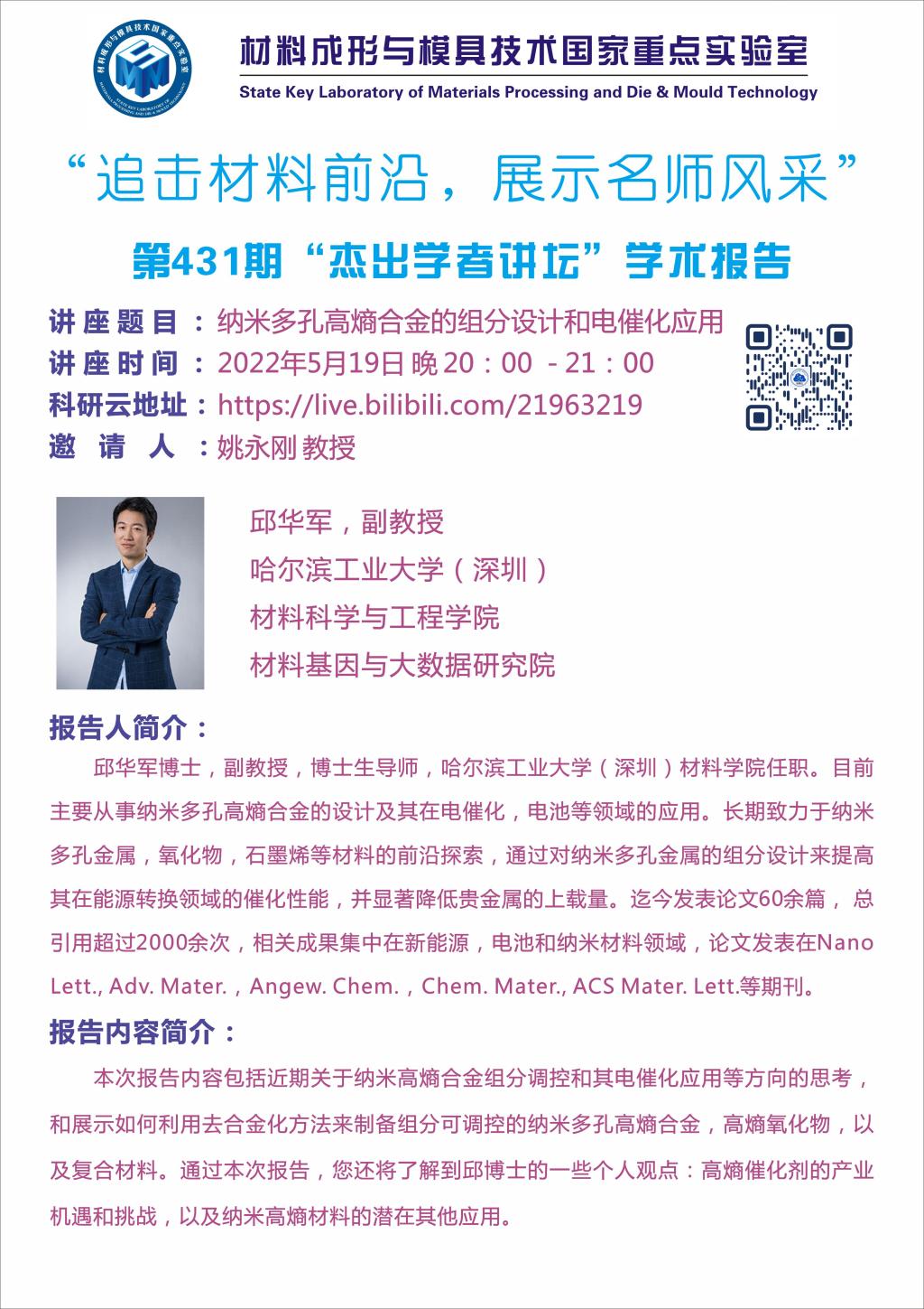 2022年5月19日"杰出学者”讲坛:纳米多孔高熵合金的组分设计和电催化应用