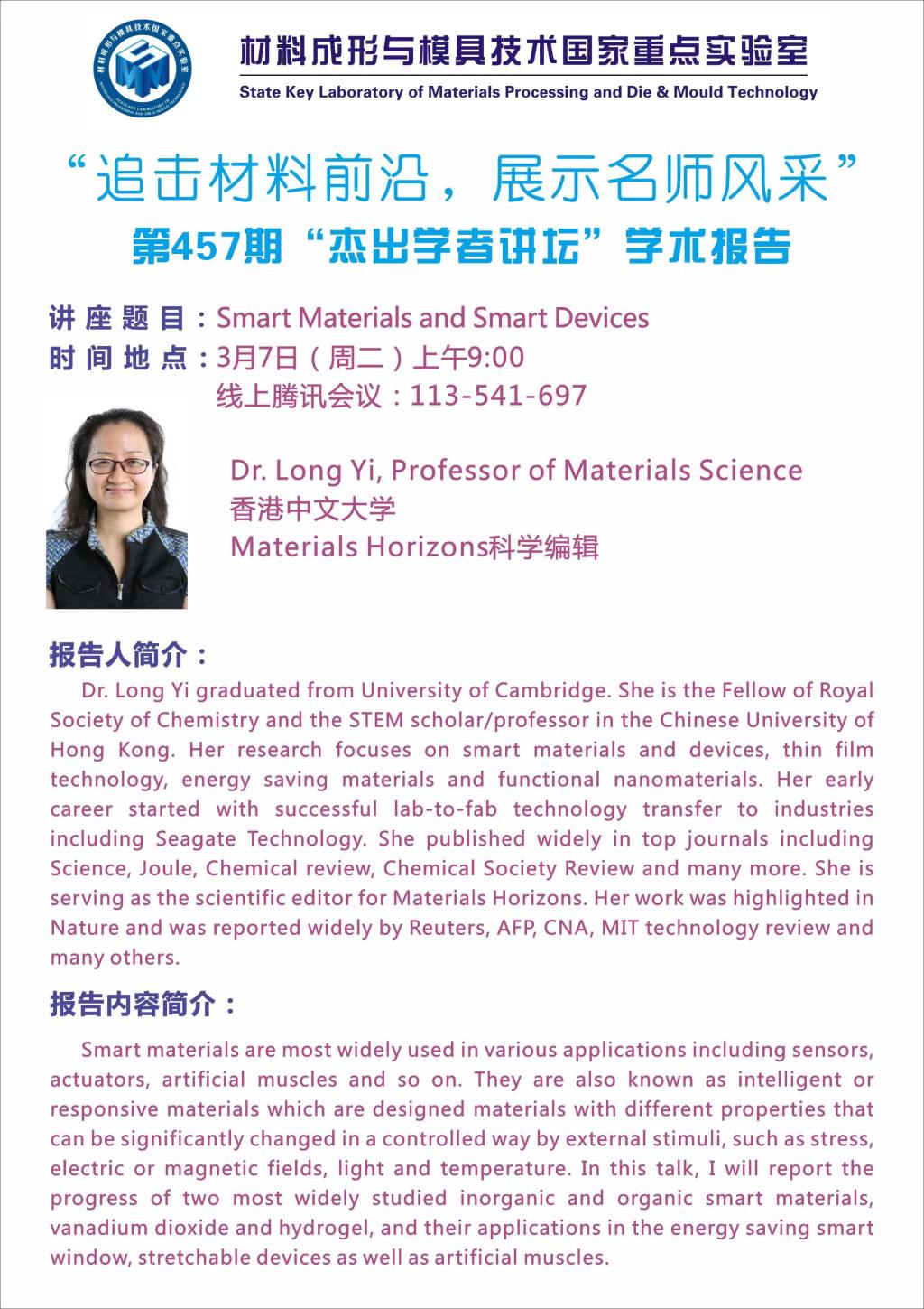 2023年3月7日“杰出学者讲坛”:Smart Materials and Smart Devices