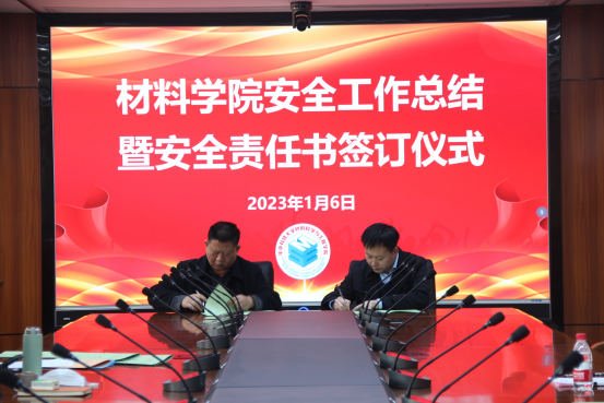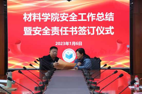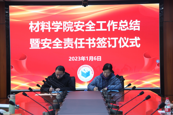 会议主要议程:1.副院长袁新华作《2022年材料学院实验室安全工作总结报告》;2.党委书记李毅做总结发言;3.签订2023年度材料学院实验室安全责任书。