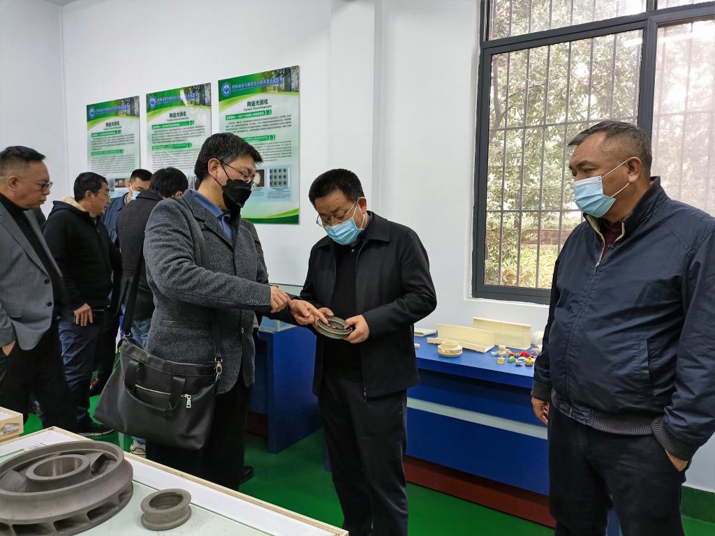 顾耀辉一行参观了快速制造中心,材料学院史玉升教授展示了各种3D打印材料、制件及其装备,并详细介绍了增材制造技术和三维测量技术在航空航天、生物医疗等行业的应用。
