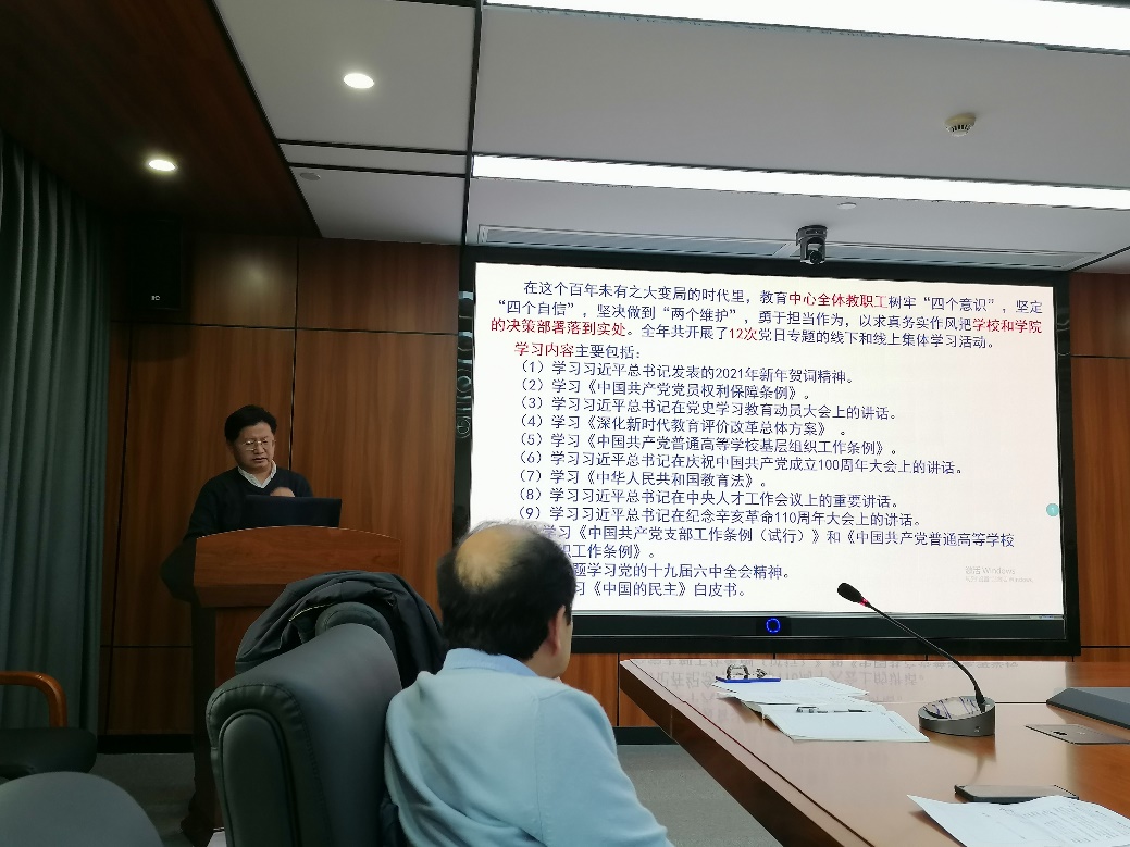 本次会议由中心书记黄开金老师主持。首先,黄开金老师总结了中心2021年的党建工作,提出了中心党支部工作的思考,引起了全体党员的热烈讨论。随后,全体党员对照党员标准,围绕评议内容,认真总结自己一年来在思想政治、工作、学习、纪律和作风等方面的情况,肯定成绩,找出差距。在此基础上,全体党员做出了合乎实际的自我评议,全体参会党员开展了党内互评,相互督促、共谋进步。