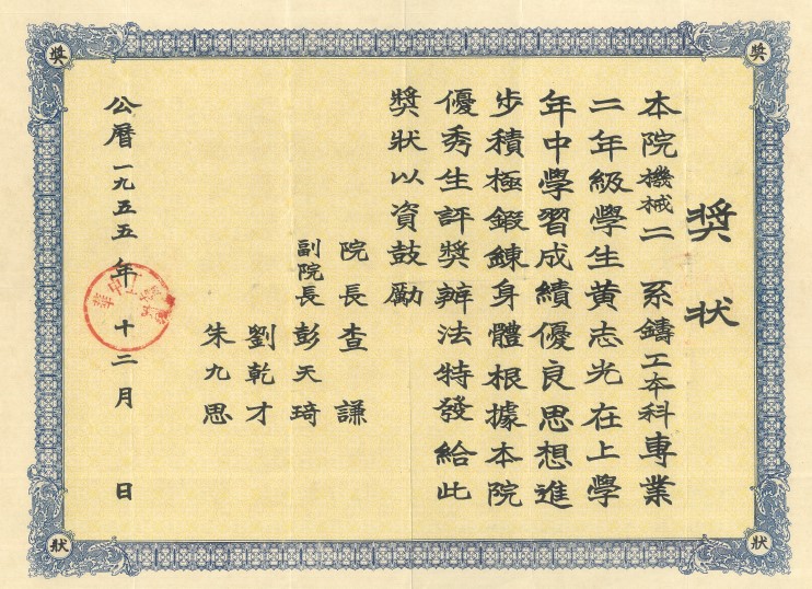 图2 1955年黄志光教授获得华中工学院优秀学生