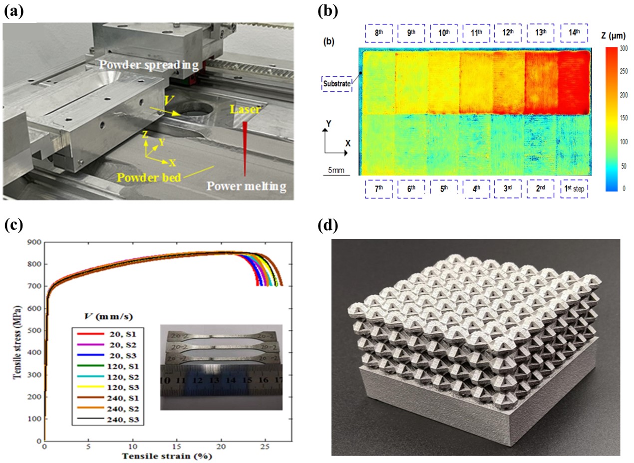图1高速铺粉下激光粉末床熔融成形:(a)高速铺粉机构 (b)阶梯试样揭示“收缩与补偿效应” (c)高速铺粉下零件力学性能 (d)高速铺粉成形复杂零件