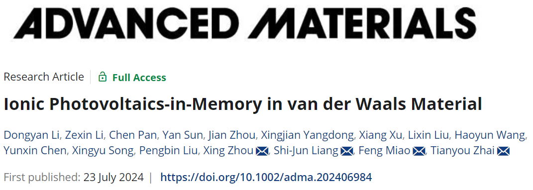 (通讯员 周兴)7月23日,《先进材料》(Advanced Materials)期刊在线刊发了我校材料学院翟天佑教授和周兴教授团队的最新研究成果“在范德华材料中的非易失性离子光伏效…